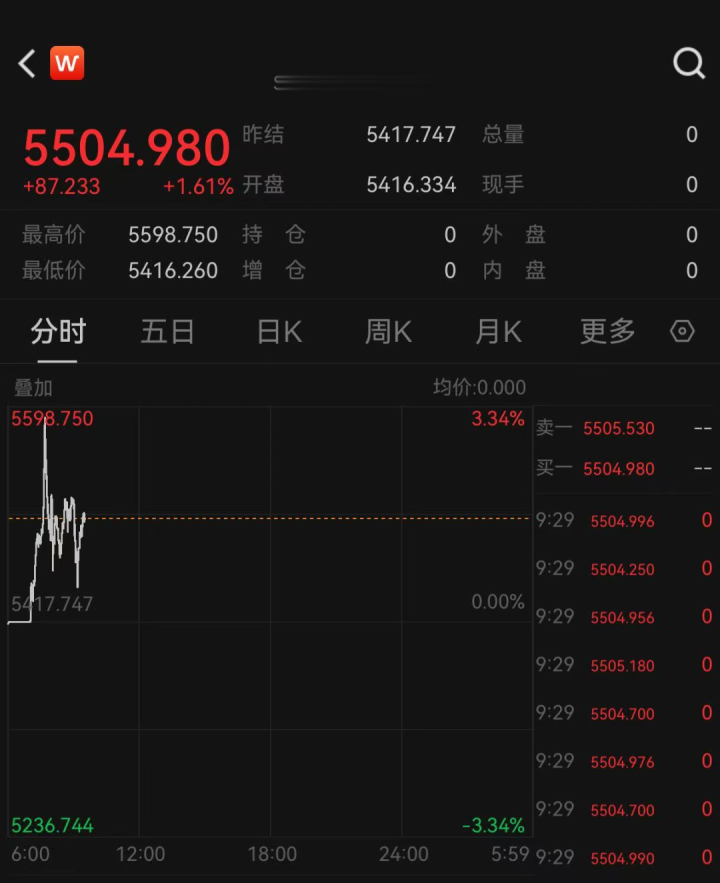 29日早间,现货黄金直线拉涨,在突破5500美元后盘中一度逼近5600美元,最高报5598.750美元/盎司,随后快速回落100美元至5500美元附近。截至发稿,报5504.980美元/盎司,涨1.61%。